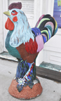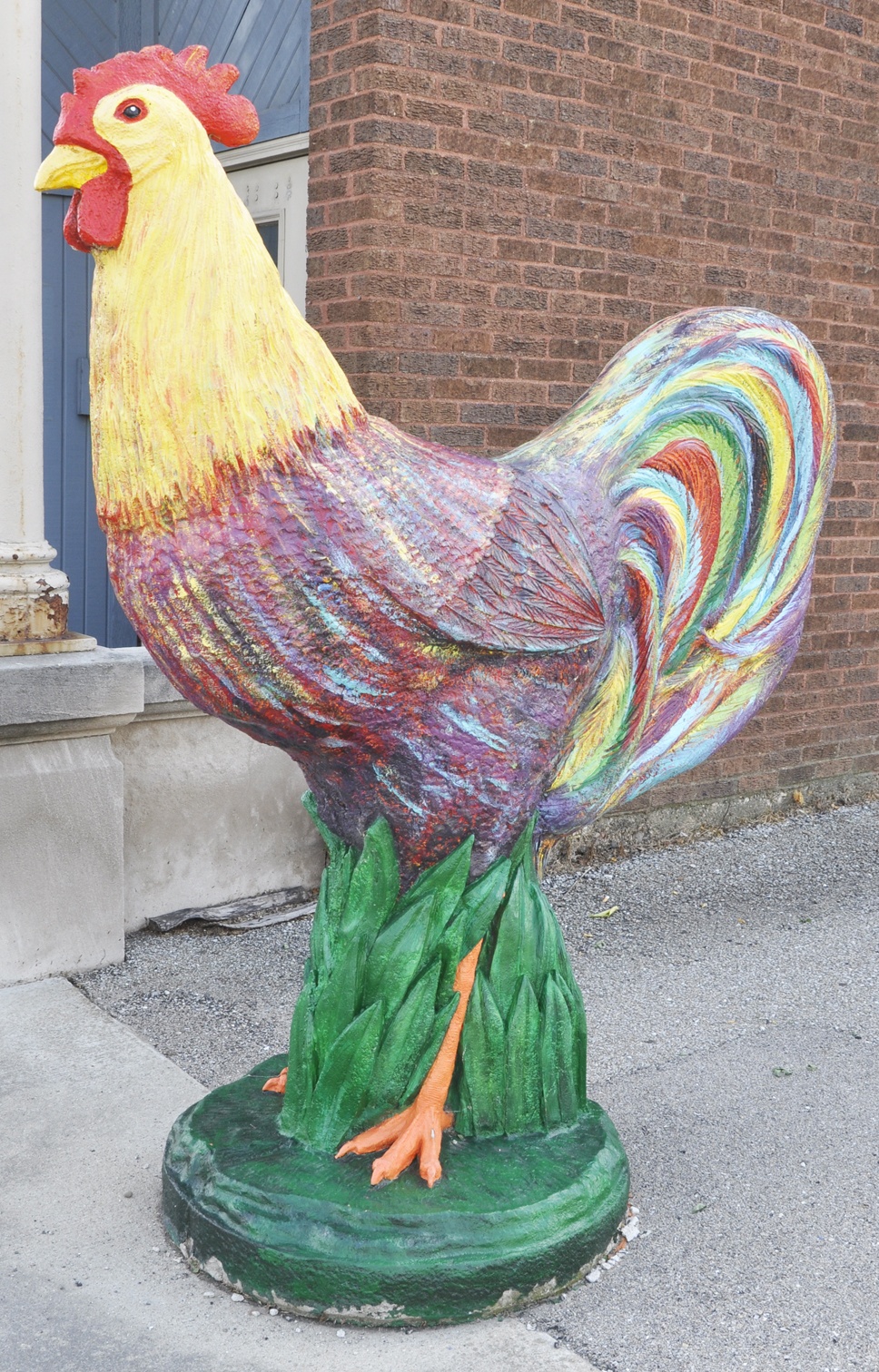 The Chicken in Tifton stood in front of the closed Wishbone Fried Chicken restaurant. It was gone in 2021. The Chicken in Webster was painted sometime after 2015. It was installed at El Curiosities which sold home decor and many statues. That business has closed but this statue remains. [map] This Chicken in Marysville was installed in front of Crazy Scotty's Building Supplies. By 2018, the store and the statue were gone. These Chickens in Brookville are among the dozen or so chicken statues scattered around downtown. The town began installing them in 2010 and I think they are still adding more. Brookville holds an annual chicken festival. The second statue shown above has a different base and comb and his beak points upwards. For more, see this website. |