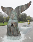 | These bronze Gray Whales are part of a water fountain. They were created in 1996 by Randy Puckett and are entitled "The Legacy." They consist of a whale calf and an adult whale breeching and another whale's tail diving into the water. The tallest whale is nearly 40 feet tall. The sculptures are located at the Birch Aquarium at the Scripps Institute of Oceanography. For more, see this website. [map] |