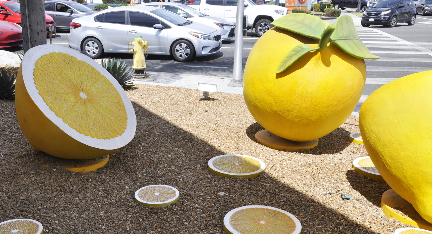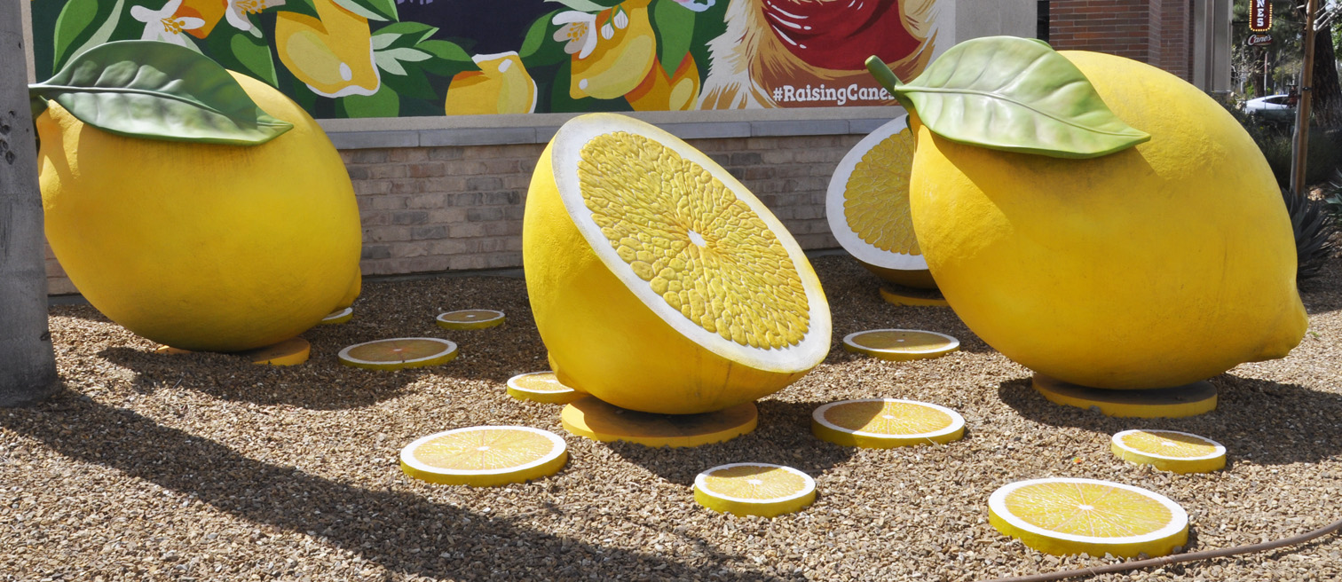 | These Giant Lemons were installed in 2024 in front of a Raising Cane's Chicken Fingers restaurant. They are a tribute to the city's citrus industry heritage. [map] |