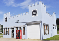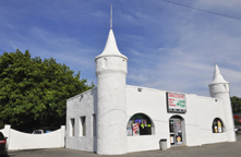 | This castle building was built as a gas station. In the 1980s, it was remodeled with this castle appearance as the Royal Roaster restaurant. It later housed the Shoe Castle shoe store and a medical office. The building now houses the Discount Smoke Shop. The crenellations were removed from the roof by 2015. Does anyone know more about it? [map] |