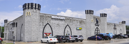 | This Castle Car Wash was built in 1997. These photos are from 2010. The business was closed in 2011. In 2012, the building was still vacant. By 2015, the tower and the castle-features on the building were gone. It was reduced to a vacant box. |