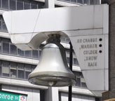 The Weather Bell was installed in 1951 for Bell Federal Savings which occupied the space below. The bell was lit in different colors as a weather forecasting device. "When Weather Bell is emerald green, no change in temperature is foreseen. When Weather Bell is glowing red, warmer weather is ahead. When Weather Bell is gleaming gold, a temperature drop is foretold. When Weather Bell is in agitation, prepare yourself for precipitation." The digital temperature and clock sign below the bell was installed later. The building now houses a Walgreens. There was at least one other Weather Bell at another Chicago branch. There was also a Bell Federal Savings weather sign elsewhere in Chicago. For more, see these websites: 1, 2, and 3. [map]