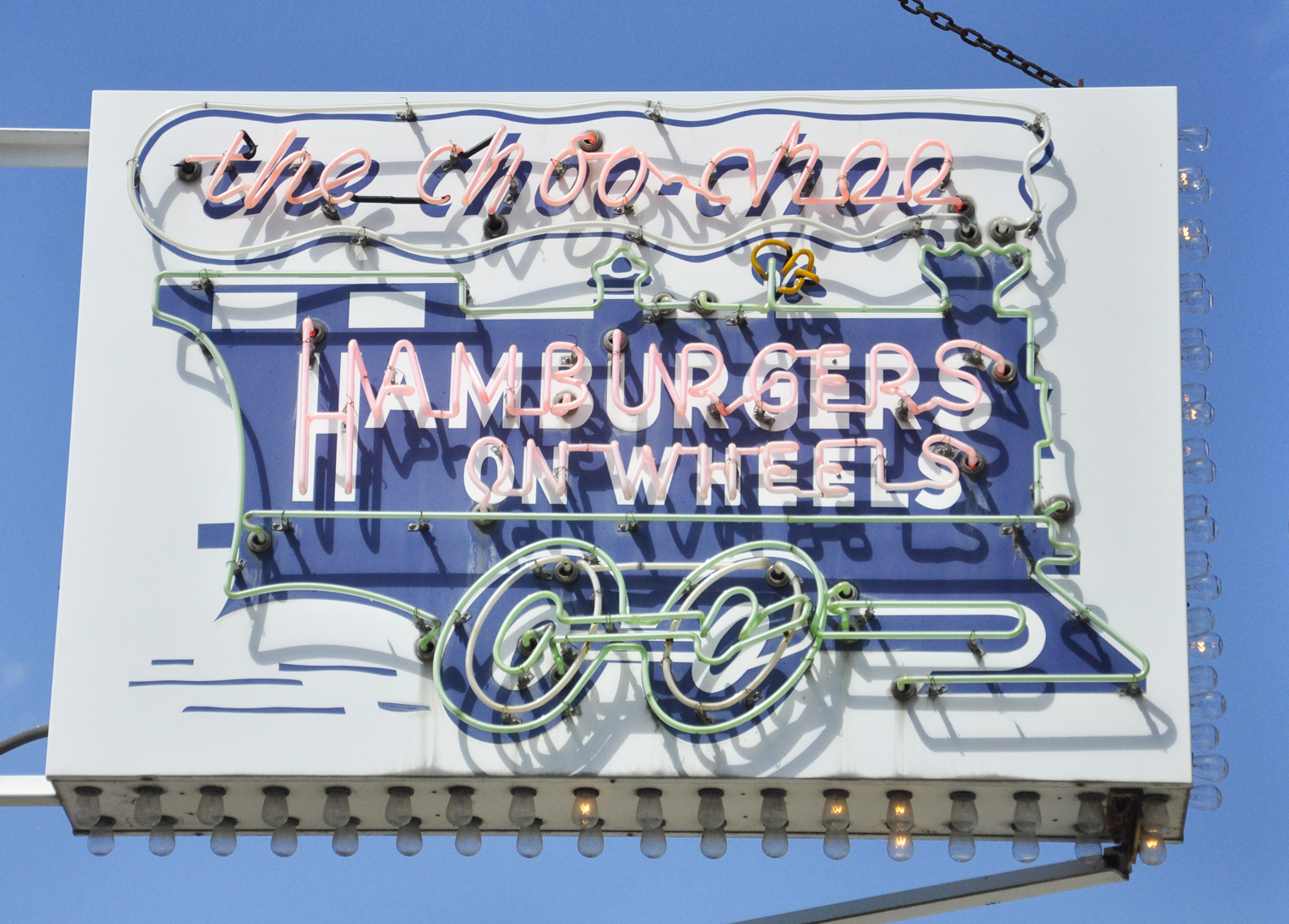 The Choo-Choo restaurant sign features a stylized steam locomotive. The sign was built in 1956 when the restaurant moved here from a few blocks away. This was the third location built in the Chicago area and it is the only one left. The first restaurant was built in Skokie in 1949. The other locations in Wilmette and Des Plaines opened in 1951. Later, locations opened in Van Nuys, CA and Fort Lauderdale, FL. What made these restaurants unique was the use of a model train to carry food. Train cars continue to deliver baskets of burgers and fries to customers seated at the counter and a few booths.