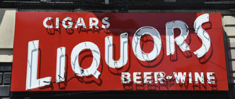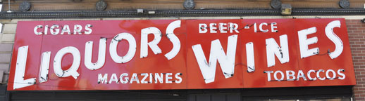 | The Woerner's Liquors signs appears to be from the late 1940s or early 1950s. The porcelain enamel panels were red and white originally. The non-projecting signs were painted black and orange in 2013. In 2025, the signs' neon was restored and the black and orange paint was removed. For more, see these websites: 1 and 2. [map] |