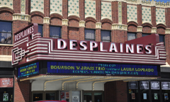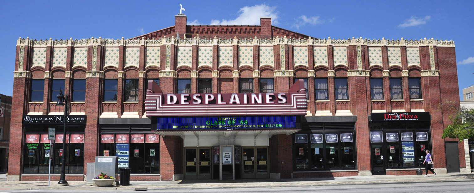 The Des Plaines Theatre opened as a vaudeville house in 1925. In 1935, it was remodeled as a movie house. In 1982, a fire nearly destroyed the theater, but it was reopened a couple of years later. It closed in 2008 and reopened later as a performing arts venue. In 2018, the City purchased the theatre. In 2019, the marquee was replaced with a replica with LED tubing. The poster display cases were removed. In 2021, the theatre reopened with live performances. For more, see these websites: 1, 2, and 3. [map]
