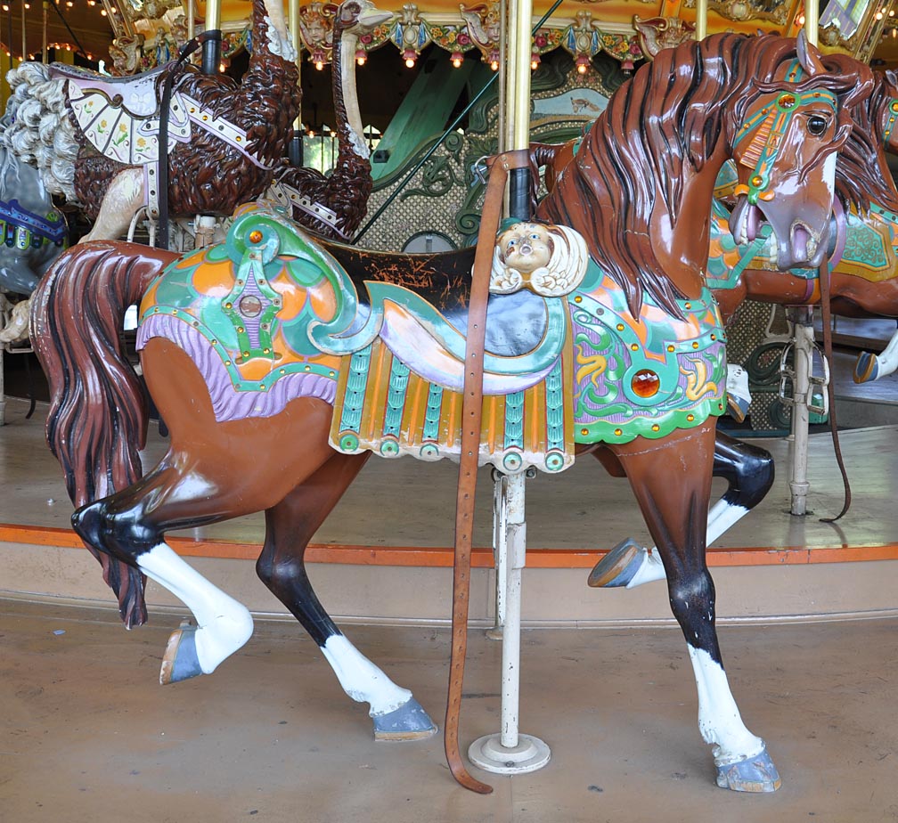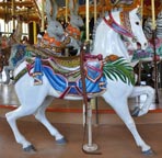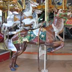 The Castle Park Carousel features a mix of original and replica figures on a Dentzel machine from 1905. There are 30 horses, 20 other animals, and two chariots. The carousel was originally installed at Hershey Park in Pennsylvania. It was installed at Knotts's Berry Farm in Buena Park, CA in the 1950s. In 1985, the carousel was moved here.