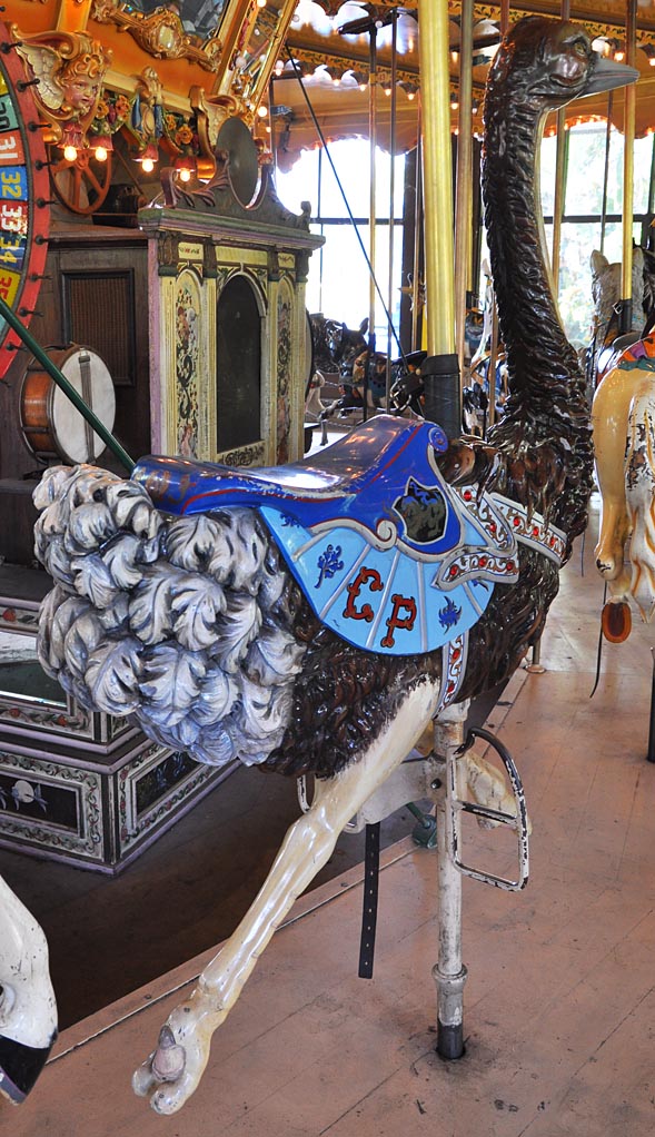 The Balboa Park Carousel is a Herschell-Spillman from 1910. It was originally located in Los Angeles' Luna Park. In 1914, the carousel was moved to Balboa Park where it has been in several locations. The carousel features menagerie figures and a functioning brass ring machine. The figures include one camel, two cats, one deer, two dogs, one dragon, two frogs, two giraffes, one goat, one lion, two ostriches, two pigs, two roosters, one tiger, two zebras, and one stork. There are also three chariots. For more, see this website.