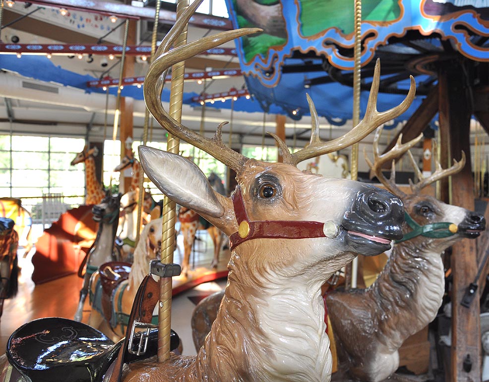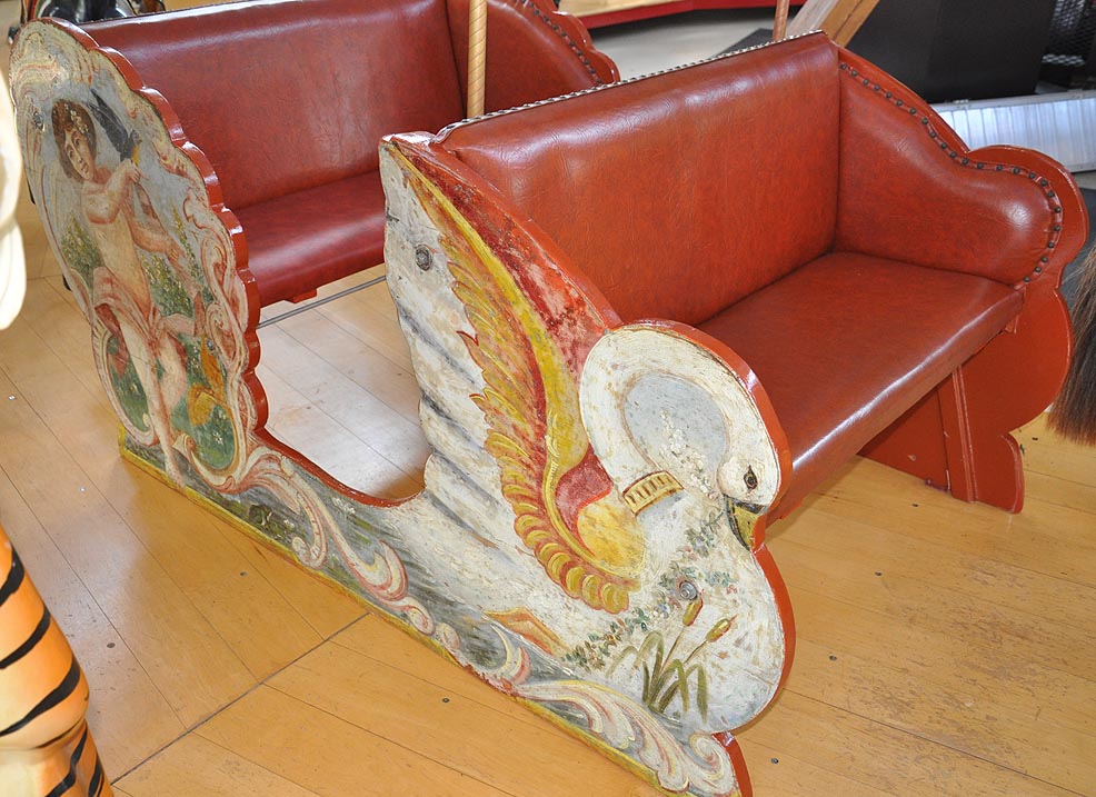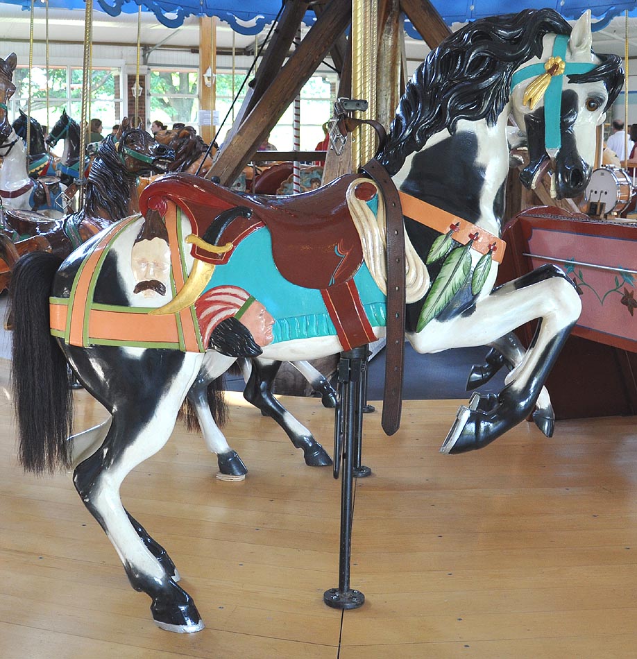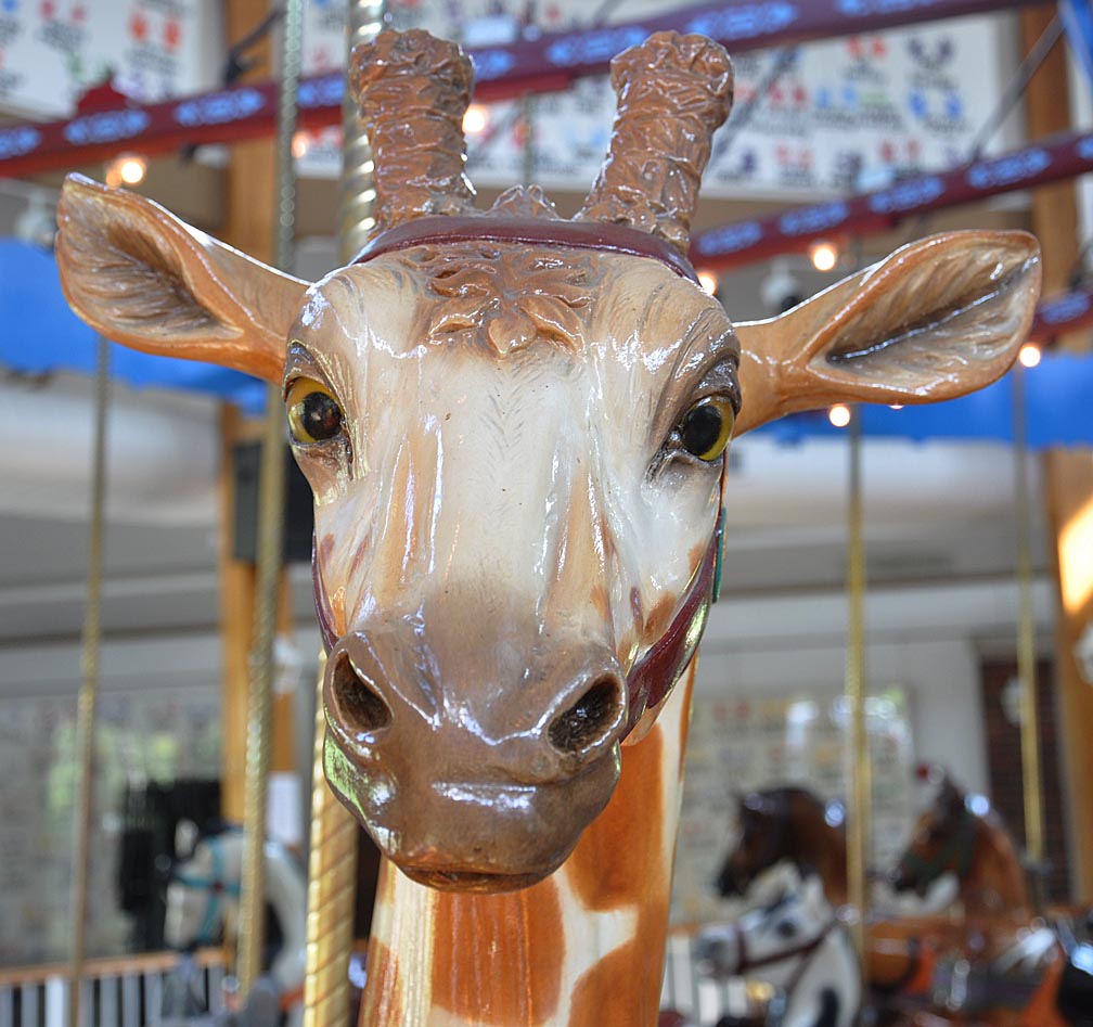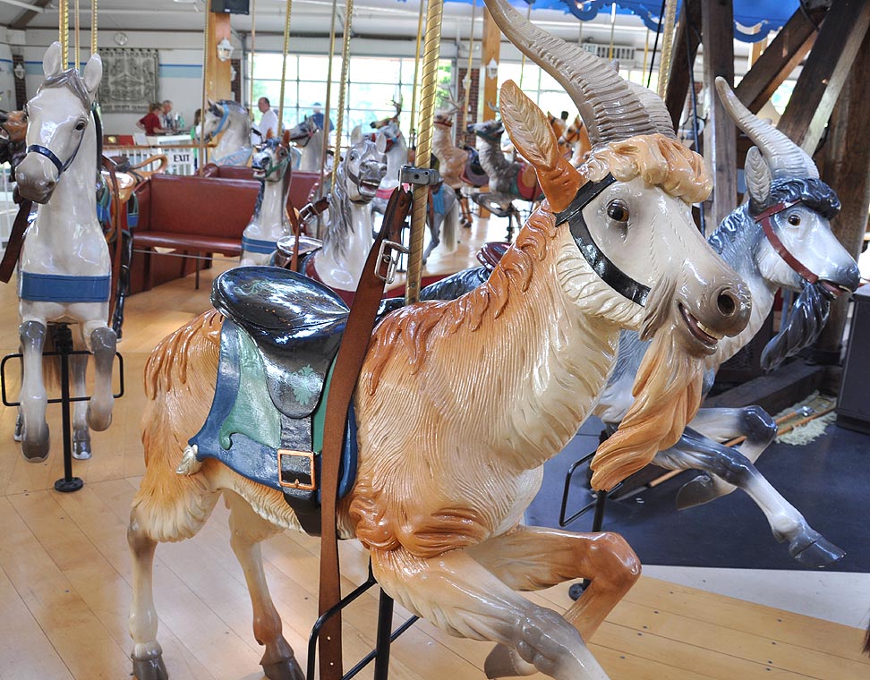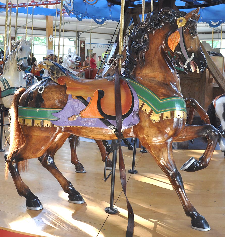 The Riverside Park Carousel is a Dentzel from 1902. It was originally installed in Fort Wayne, IN. In 1919, it moved to Spencer Park in Logansport. In 1950, it moved here to Riverside Park. It was restored in 2008. These photos are from 2009. This carousel features 33 horses, three giraffes, three goats, three deer, one lion, one tiger and three chariots. There is a brass ring machine which I did not photograph. This carousel is listed on the National Register of Historic Places. It is one of only three remaining stationary Dentzel carousels. The figures do not move up and down. Most of these carousels were converted later with jumping mechanisms in the early 1900s. another carousel or is a replica. There is also a 1922 Wurlitzer band organ. For more, see this website.