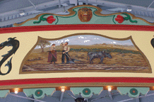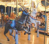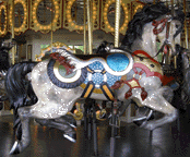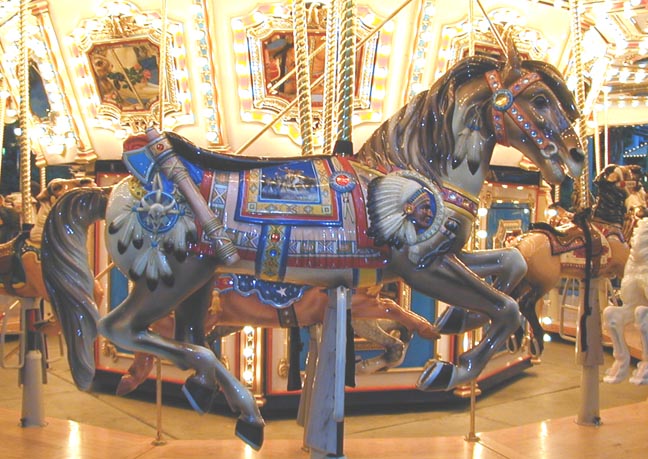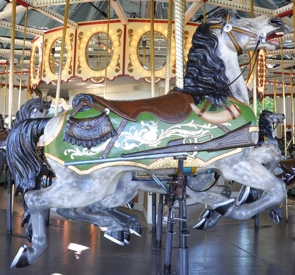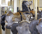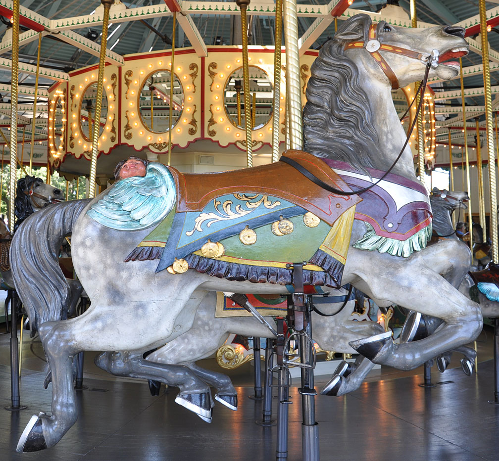 The Cafesjian's Carousel (PTC #33) was built in 1914. It is a four row carousel with 68 jumping horses and two chariots. Three of the horses were carved by Carmel and the rest by the Philadelphia Toboggan Company. There was a fire in 1939 and several of the horses were damaged. You can still see the charred surfaces under the paint on some of them.