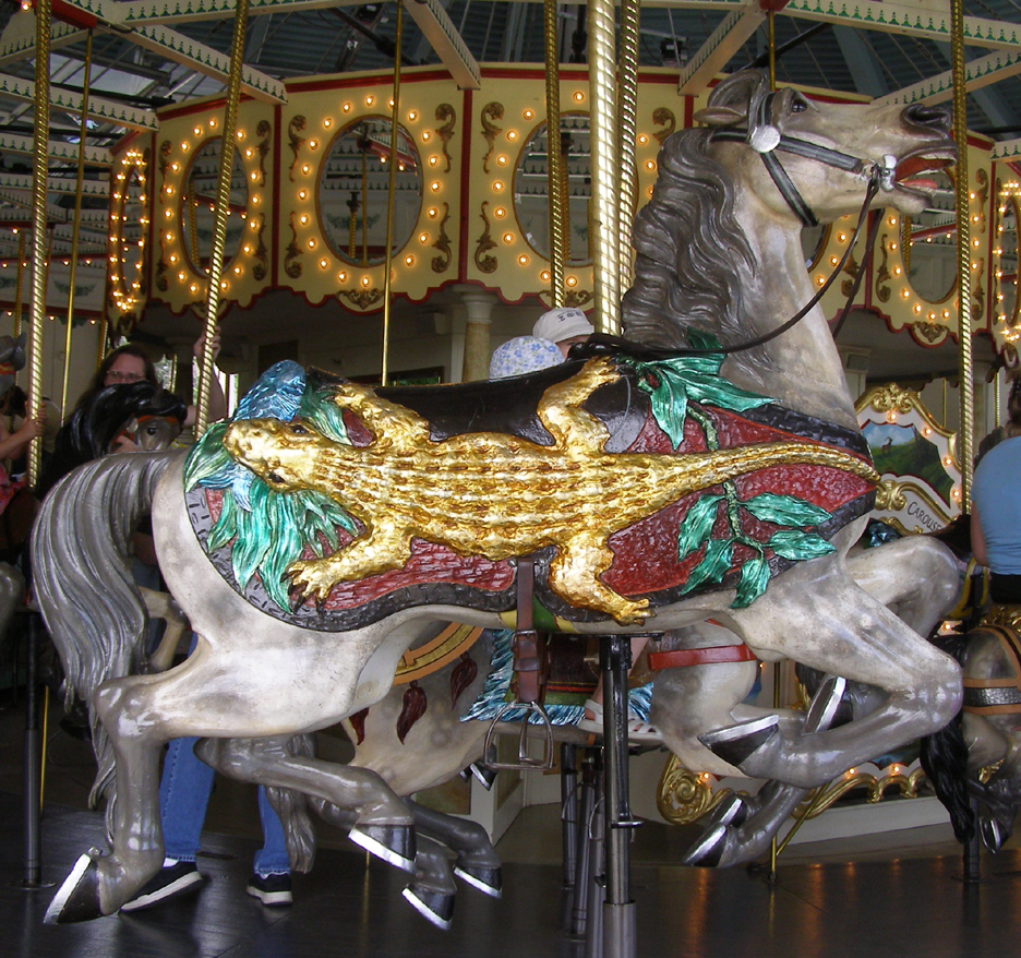 The "Americana" Carousel at the Mall of America is a reproduction style carousel ("a hand-painted contemporary version of the classic American merry-go-round"). It features 34 figures and one chariot. Despite its lack of historic value, it is in great shape and wonderful in its garishness which will hopefully instill appreciation for carousels and ensure their preservation.