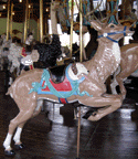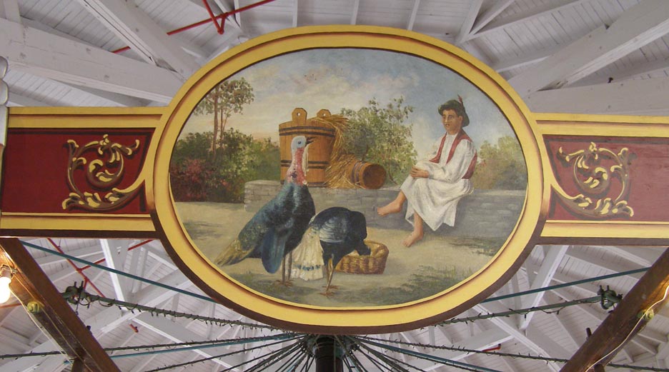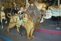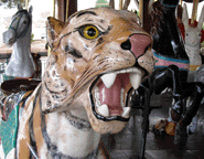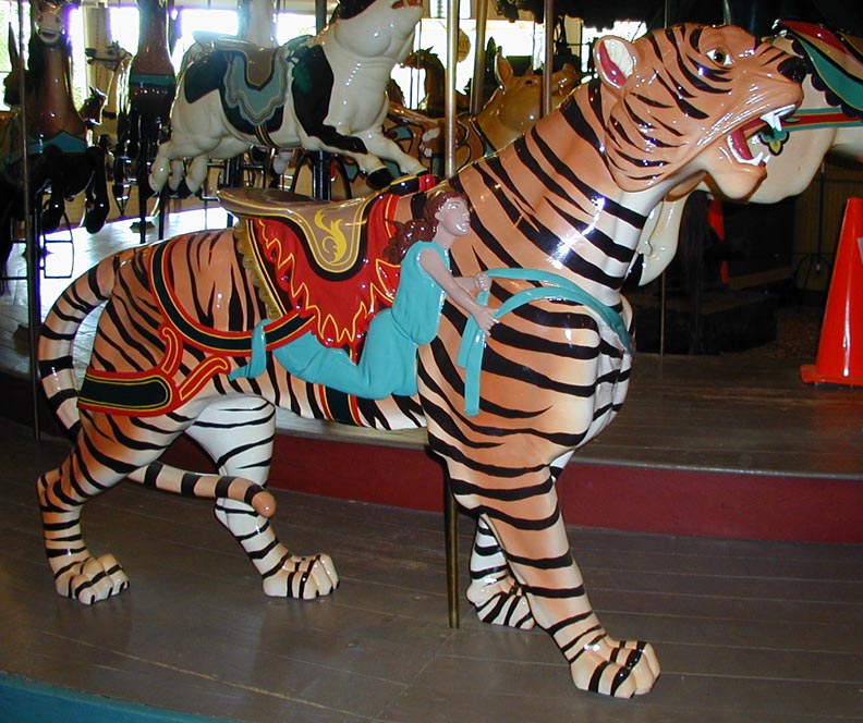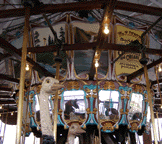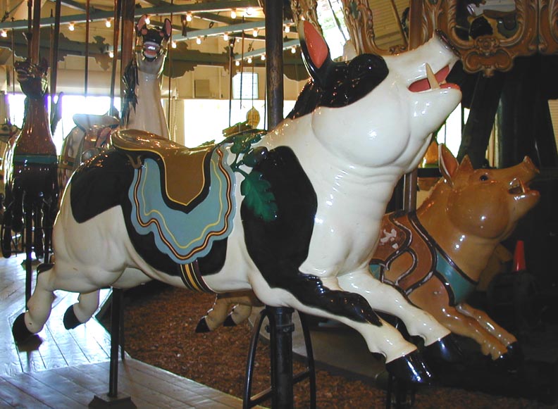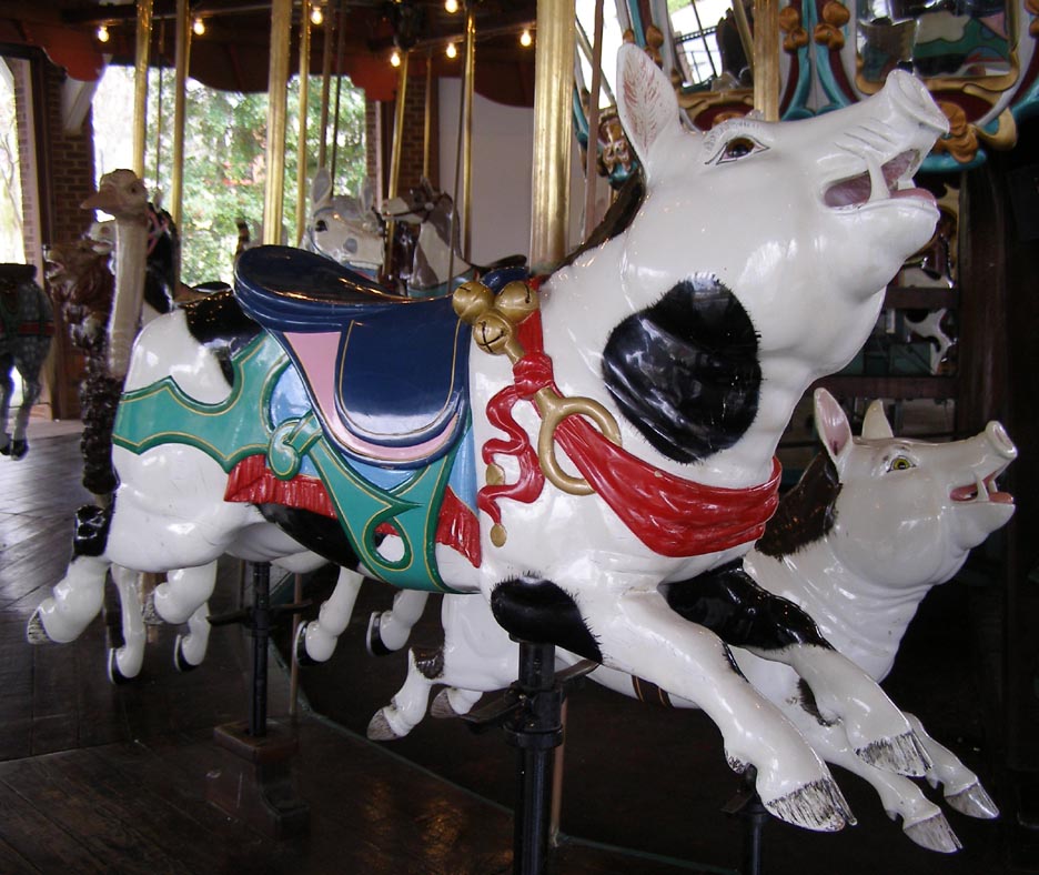 The Menagerie Carousel is a 3-row Dentzel from around 1906-1910. It was located in the 1920s at the Locust Point Amusement Park in Oak Harbor, OH and later moved to the Forest Amusement Park in Genoa, OH. It was moved here in 1948. It was restored from 1981-1985 and is listed on the National Register of Historic Places. The 46 figures include: 26 horses and two chariots, as well as four ostriches, four cats, four rabbits, four pigs, one reindeer, one giraffe, one lion, and one tiger. For more, see this website.