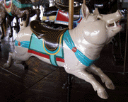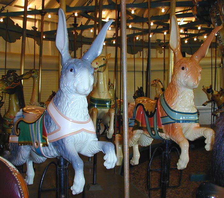 The Pullen Park Carousel is a Dentzel from 1912. It was moved here in 1921. The carousel has 19 jumping horses, 10 standing horses, 4 cats, 1 deer, 1 mule, 4 ostriches, 4 pigs, 4 rabbits, 2 giraffes, 1 tiger, 1 lion, 1 goat, 2 chariots and a Wurlizter Model 125 Military Band Organ. Restoration took place in 1977, again 1982, and is still ongoing. For more, see these websites: 1 and 3.