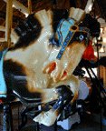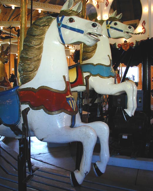 The 1916 carousel was one of the first machines the company shipped and is still being restored. It has 36 horses combining two different styles. The outer horses were the modern Herschell style while the inner rows were of a more primitive style from the late 1890s. There is also a chariot and a "lover's tub" which can be spun. The carousel features a Wurlitzer band organ circa 1910. The 18-sided roundhouse in which the carousel is displayed is also a restored original building. The 1940s "Kiddie Carousel" is made of aluminum and has been completely restored. It was created for small children to ride without adults. The horses are child-size and the machine moves more slowly. For more, see this website. |