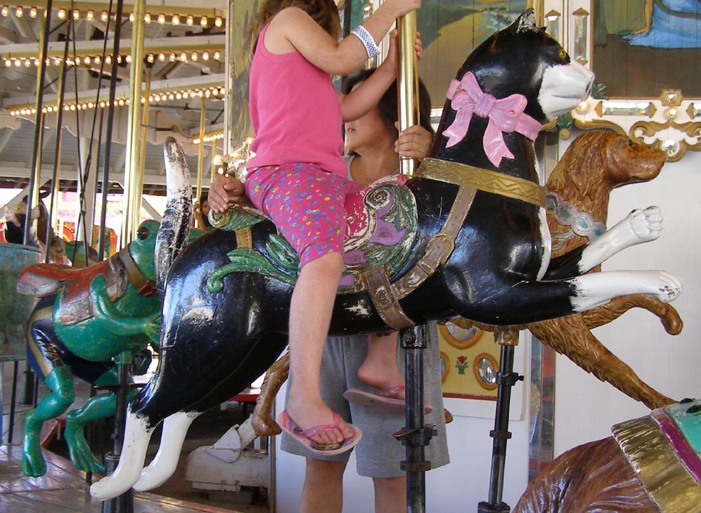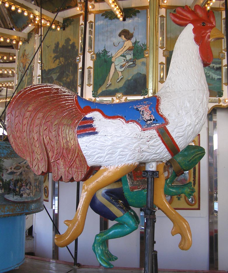 | The Oaks Park Carousel is a Herschell-Spillman from around 1911. It has been here since 1924. The figures include 13 jumping horses, 11 standing horses, one cat, one deer, two dogs, one dragon, four frogs, two giraffes, one goat, one kangaroo, one lion, two ostriches, two pigs, two roosters, one stork, one tiger, two zebras and two mules. There are also two chariots and two tubs. For more, see these websites: 1 and 2. |