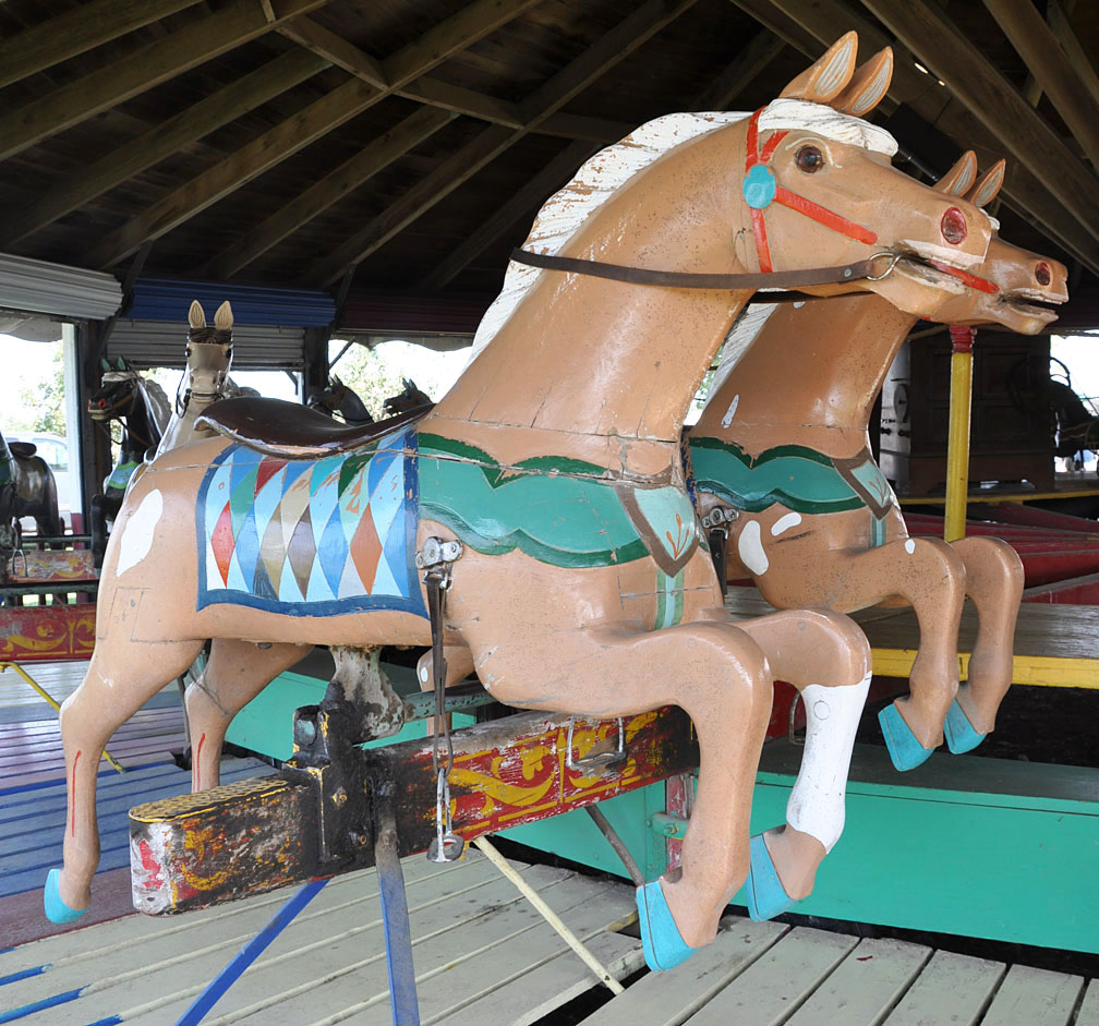 | The Prairie Village Carousel was built in 1900 by Herschell-Spillman. There are 28 horses and two chariots. The carousel can be operated by steam or gas. It was originally located in Fargo, ND. It has been here since 1967. For more, see this website. |
