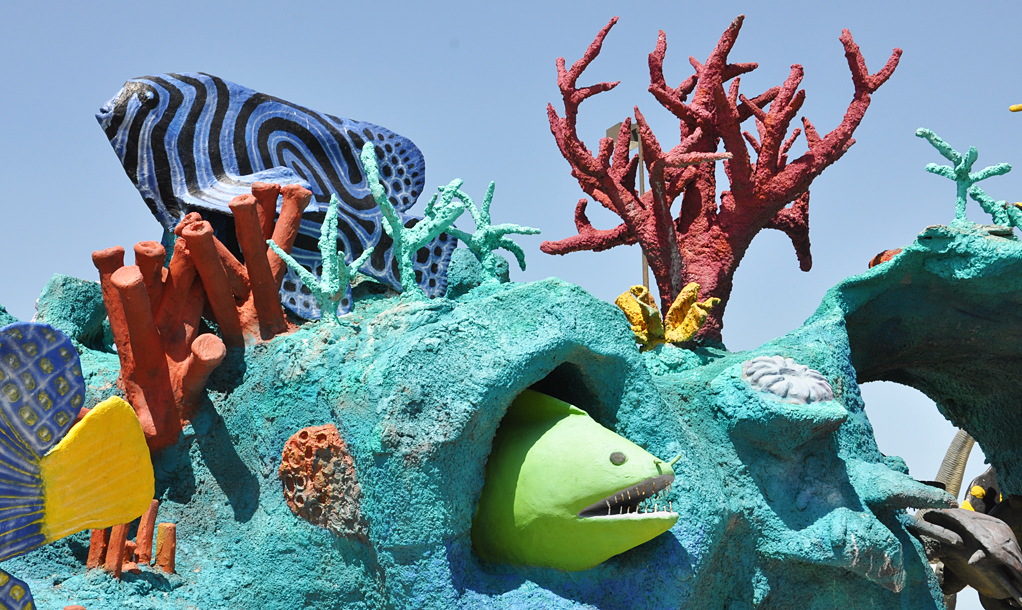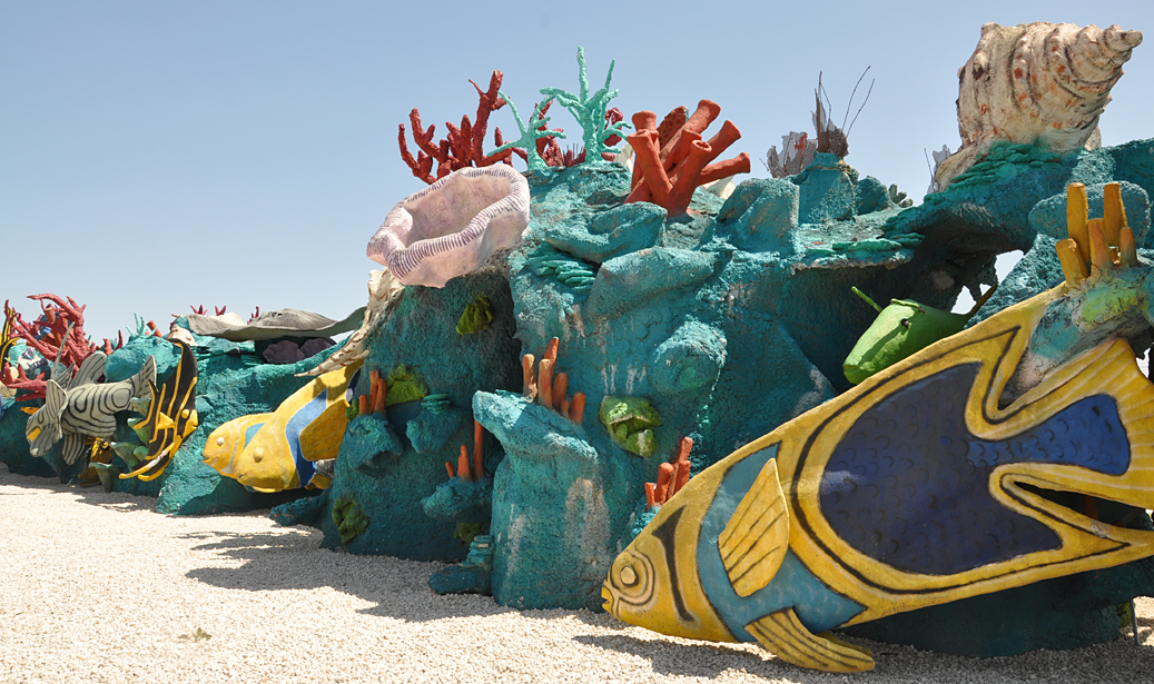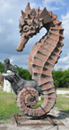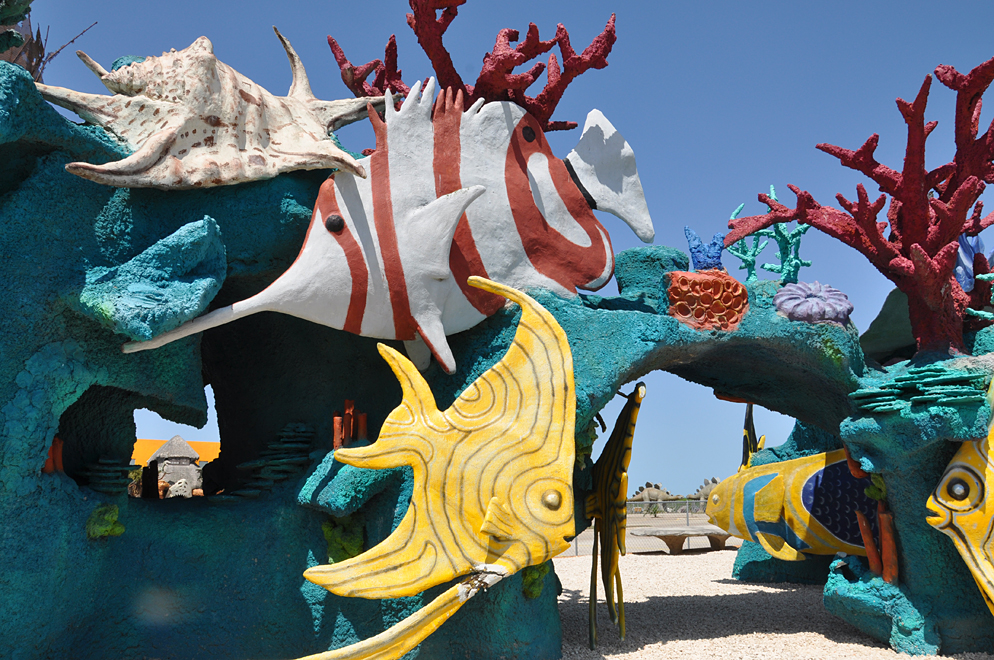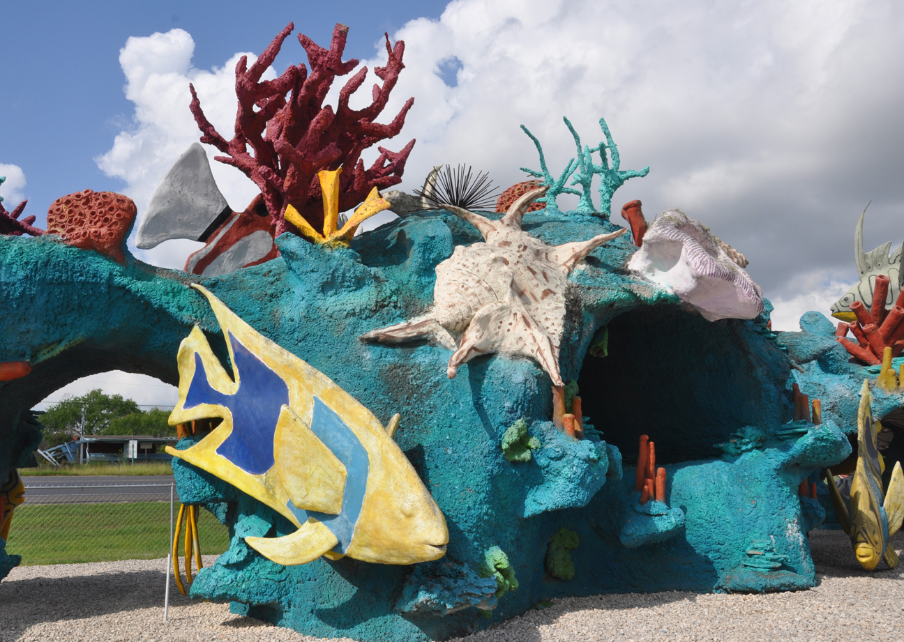 Seven Seas is a huge retail and wholesale operation that sells seashells, nautical items, souvenirs, gifts, etc. In front of the store, there is a quarter mile coral reef with fish, a shark and other sealife. Two giant conch shells flank the store's entrance. Inside the store, is Bobz World with more dinosaurs and other statues. In 2011, a giant King Kong and Easter Island heads were added. By 2018, the statues had been painted but were obscured by foliage. In order to get a better view of them, you need to pay the $12 admission fee to Bobz Journey which has other statues of dinosaurs, cowboys, and more. Seven Seas is or was owned by U.S. Shell which also operates a second store with giant shells in Port Isabel, TX. For more, see this website. [map]