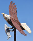 These metal sculptures were created by Elton Brown. They have been installed in front of his home since at least 1996. The sculptures are made from sickle bar mower teeth, used for cutting hay, and rebar. The shark is 14 feet long. The dinosaur is over 11 feet tall. The alligator is 15 feet long. These photos are from 2016. By 2021, the statues were all gone.