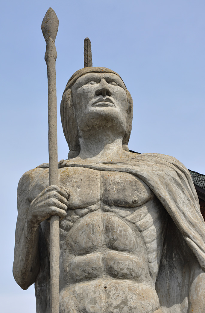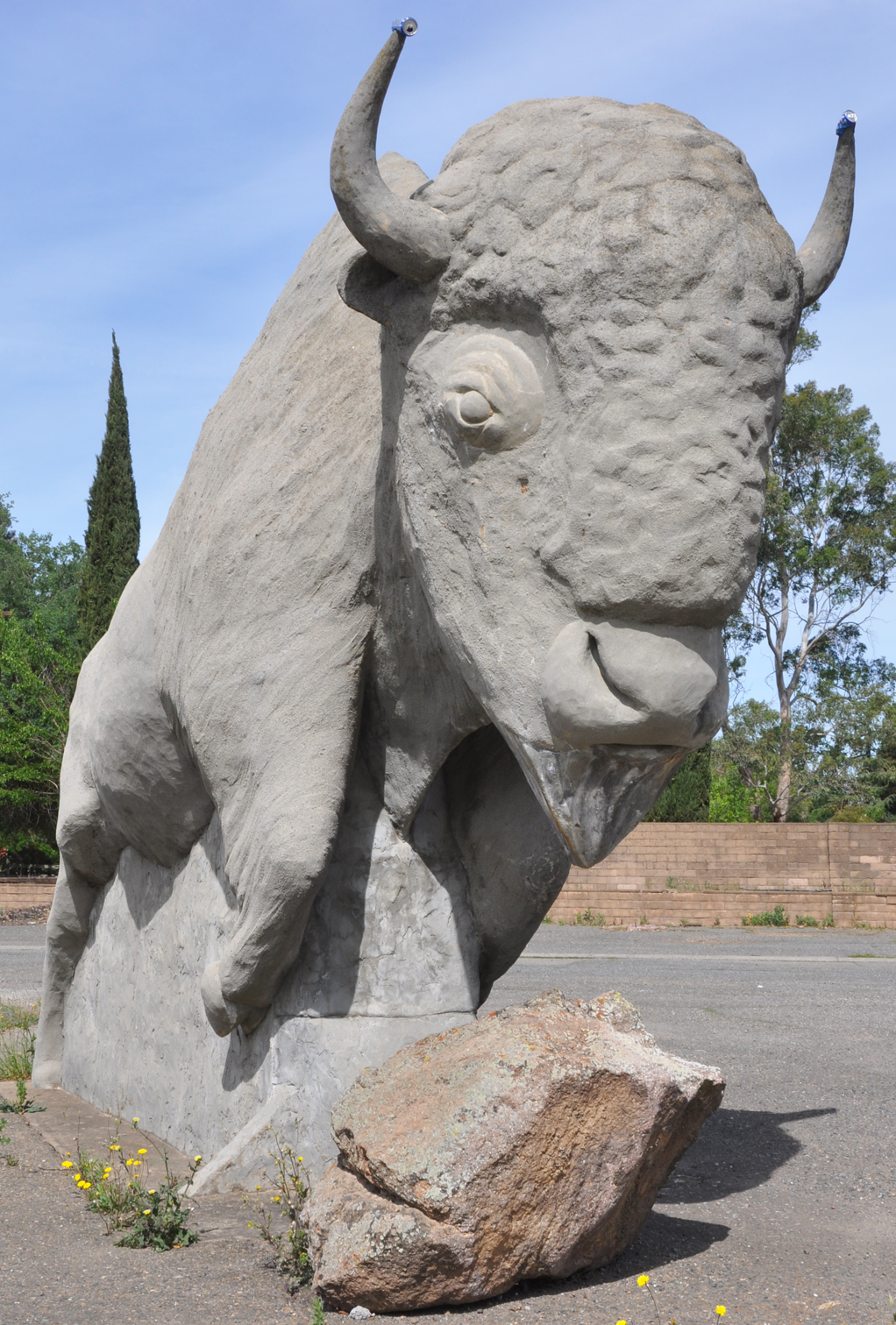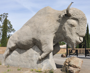 Steele Realty opened here around 1988. Ray Steele has been adding statues and farming equipment to his office interior and property since then. These statues have been there since at least 2003. The statues of the Miner and Abraham Lincoln were gone by 2014. The Indian and Buffalo statues are still there. They appear to be the work of Ken Fox who has created other giant statues in California. The Buffalo contains a time capsule in its hump. [map]