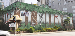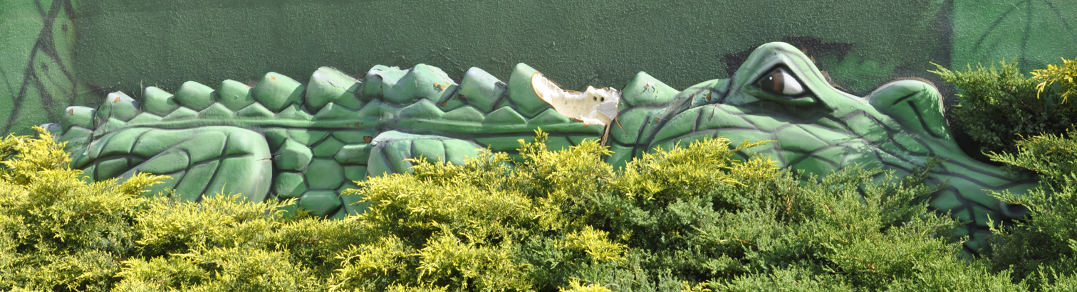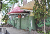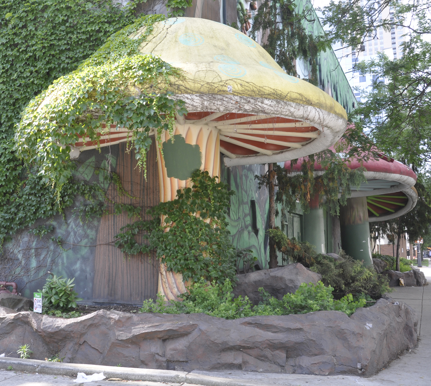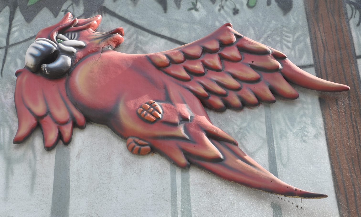 This Rainforest Cafe operated from 1997-2020. The building remains vacant but these decorations remain. There was originally a giant tree frog on the corner of the roof. There are or were other statues inside the restaurant. For more, see this website. [map]