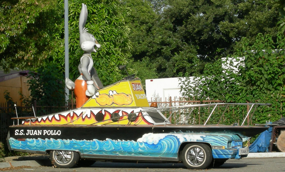| The S.S. Juan Pollo was located at Juan Pollo's corporate headquarters which doubles as a McDonald's museum. Apparently, the rooster is or was sometimes replaced with these Bugs Bunny, Sylvester the Cat, and Tasmanian Devil statues. The car had been repainted and rechristened as the SS Chicken Boat by the time of the 2015 Doo Dah Parade. By 2019, the car was kept in private storage. It is still used in parades. There are still at least two roosters at the museum. For more, see these websites: 1, 2, and 3. [map] [second row photo from 2008 thanks Glenda Campbell] |