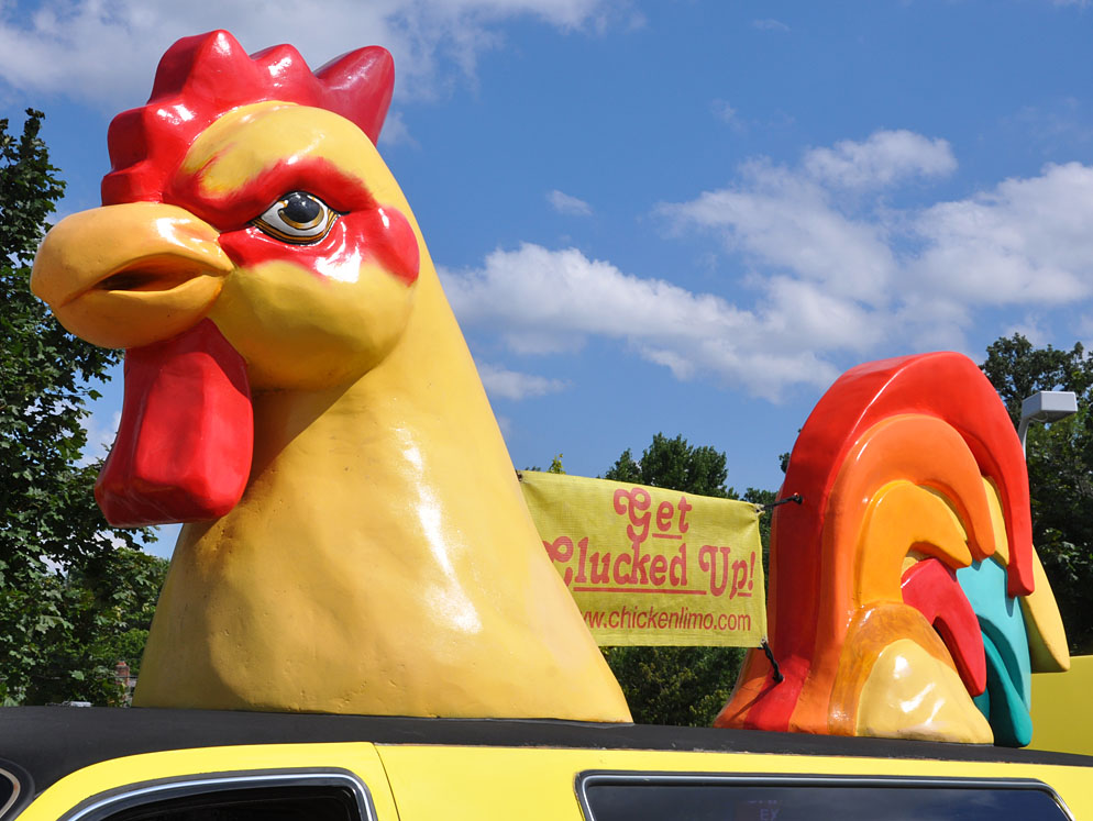 | The Chicken Limo was inspired by the Indy Chicken. John Barker, the chauffeur and business owner, had this car made in 2007. He is considering expanding to Tampa, Scottsdale, and Los Angeles. For more, see these websites: 1, 2, and 3. |