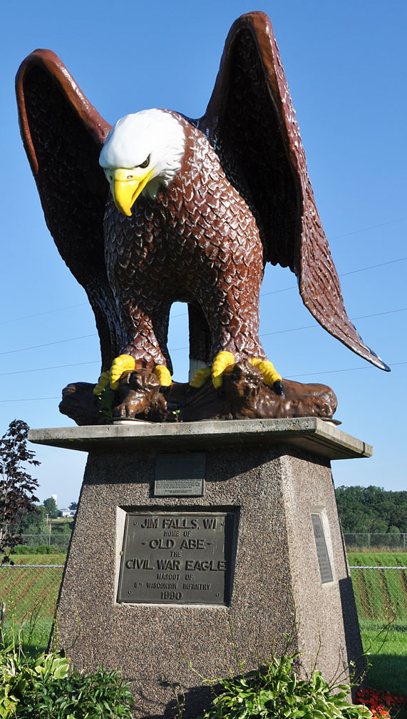 The Eagle in Jim Falls is another tribute to Old Abe. This ten-foot-tall fiberglass statue was installed in 1990. It is located near the Northern States Power Company power station. This statue appears to be from the same mold as the one in Park Falls shown above. I don't know which was produced first. For more, see this website. [map]