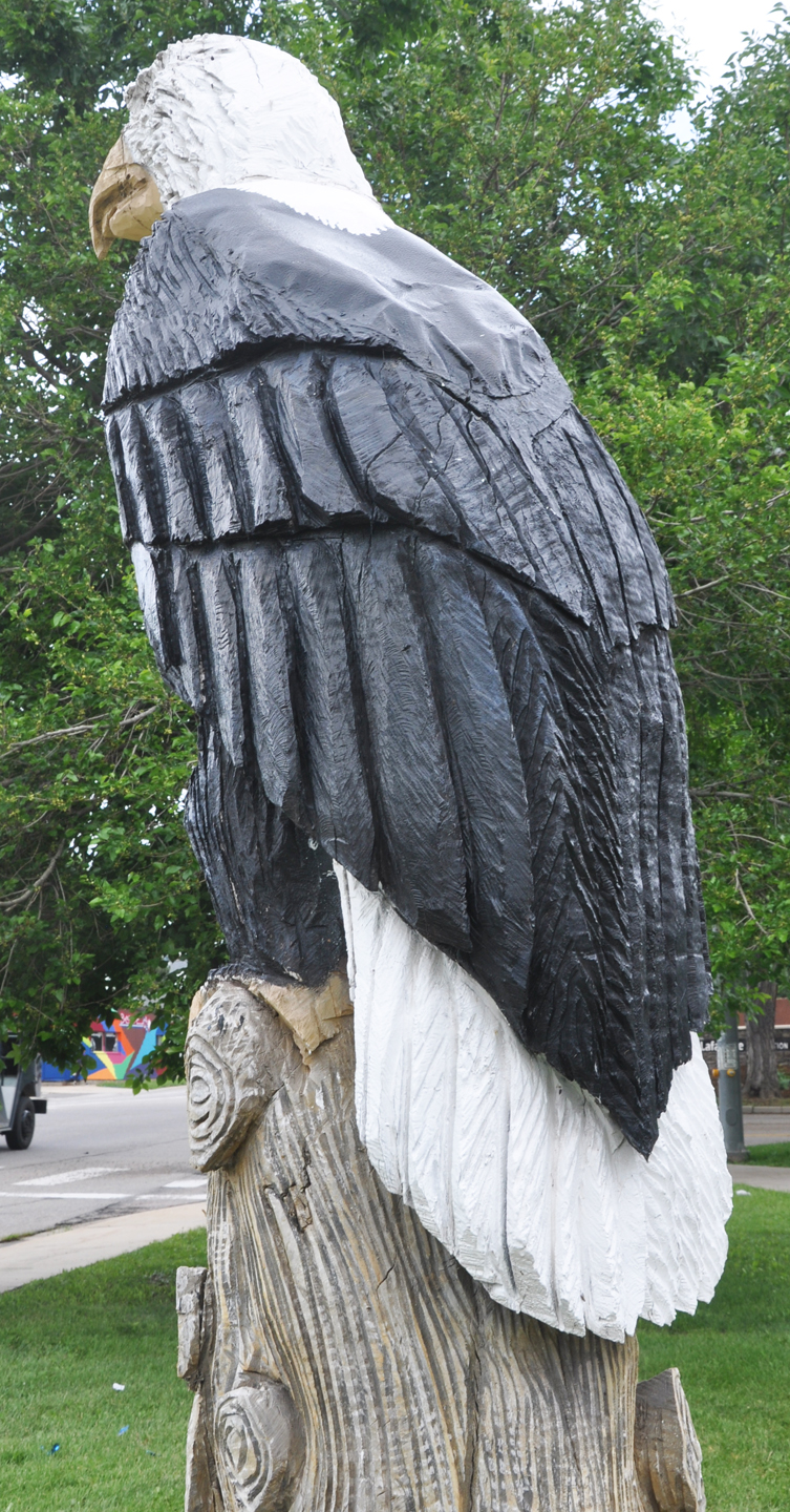 This Eagle in Aitkin was installed in 1991 to honor veterans. It was installed in front of the Aitkin County Courthouse. The statue is a chainsaw wood carving created by Larry Jensen. It is about seven feet tall. This photo is from 2011. In 2012, the statue was restored and installed inside the courthouse. For more, see this website.