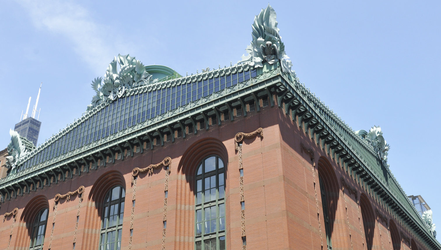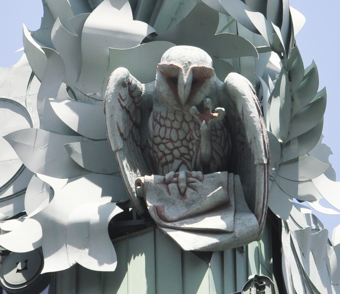 | These four 12-foot-tall Barn Owls were installed on the corners of the roof of the Harold Washington Library Center in 1993. They symbolize knowledge and wisdom. The owls are surrounded by giant leaves and seed pods. The sculptures were designed by Ray Kaskey and produced by the Kent Bloomer Studio. There is also a horned owl with spread wings over the entrance. [map] |
