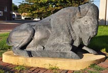 | These Buffalo statues in Madison and Huron are at the two locations of Prostrollo new car dealerships. These fiberglass representations of "Big Medicine" were built by FAST. They are 12 feet tall and 20 feet long. The first one was installed in Madison around 1970 while the one in Huron has been there since 1987. The fur on top of both statues' heads was painted brown until sometime between 2012 and 2015. [Madison map]; [Huron map] |