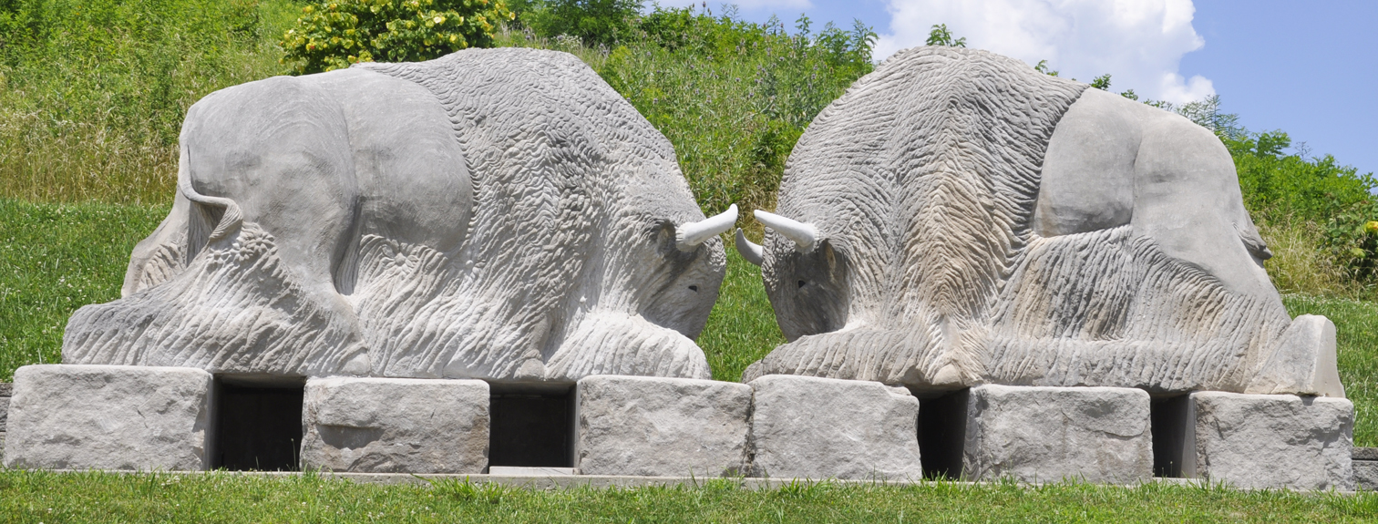 This limestone sculpture of Buffalos in New Albany was created by David Ruckman and installed in 2018. It is located on the Buffalo Trace Route which were paths used by migrating buffalo and early settlers. [map]