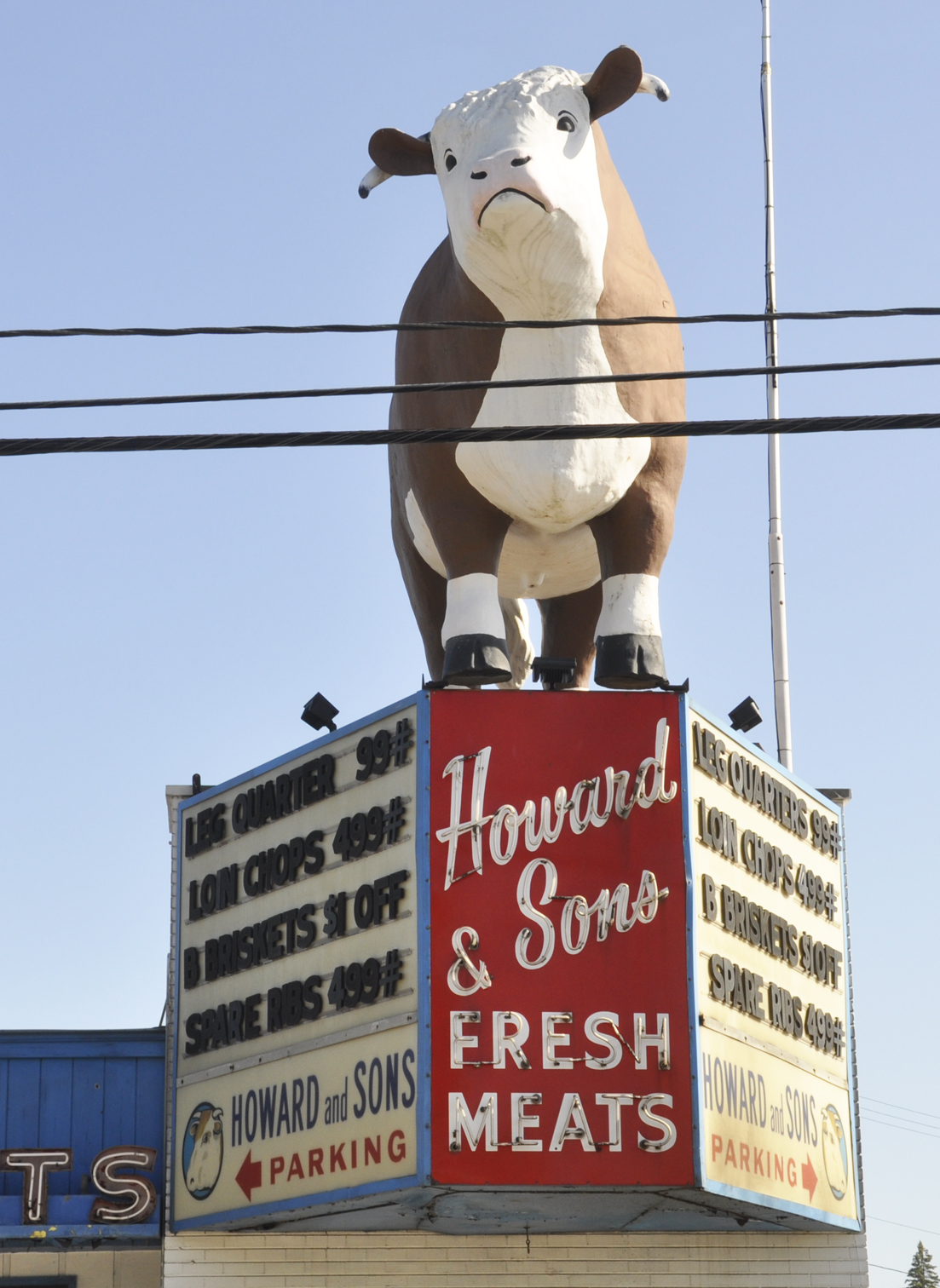 | Howard & Sons' Munster store opened in 1956. There was a different statue on top of the sign in the 1960s. This statue is nicknamed Howie. [map] |