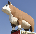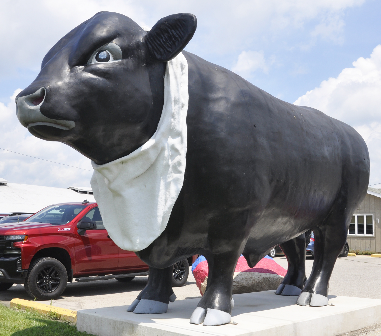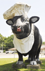 | The Bull statues below with the chef's hats are a different model from those shown above. They are smaller, the body and head are not as beefy, the ears are smaller, and the head is cocked slightly to the left. The horns curl around from behind the ears. The left hind legs are next to one another. The chef's hats are taller than those above. These statues probably all came with a protruding tongue like the one in Onsted shown below. These statues were produced by Sculptured Advertising in Sparta, WI in the early 1960s. |