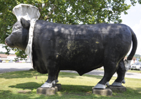 | This Bonanza Steakhouse bull, known as "Curly," was originally installed in 1967 at the Bonanza in Springfield, IL. It is the same type as the Lincoln and Chicago Heights statues shown above but without the bib and chef's hat. In 1995, the statue was moved to the Bonanza restaurant in Lincoln, IL. When the restaurant closed in 2018, the statue was sold and moved to the 217 Roadhouse Bar and Grill in Atlanta, IL. [map] |
