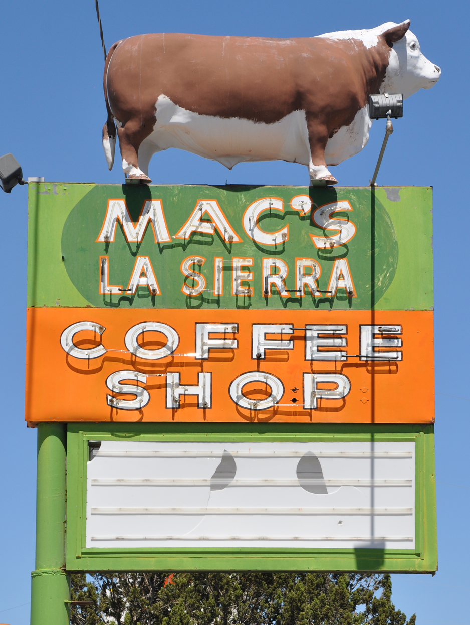 | This Bull is installed on top of the sign of Mac's La Sierra Coffee Shop. The restaurant opened in 1952. There was originally a neon sign with a representation of a bull. For more, see this website. [map] |