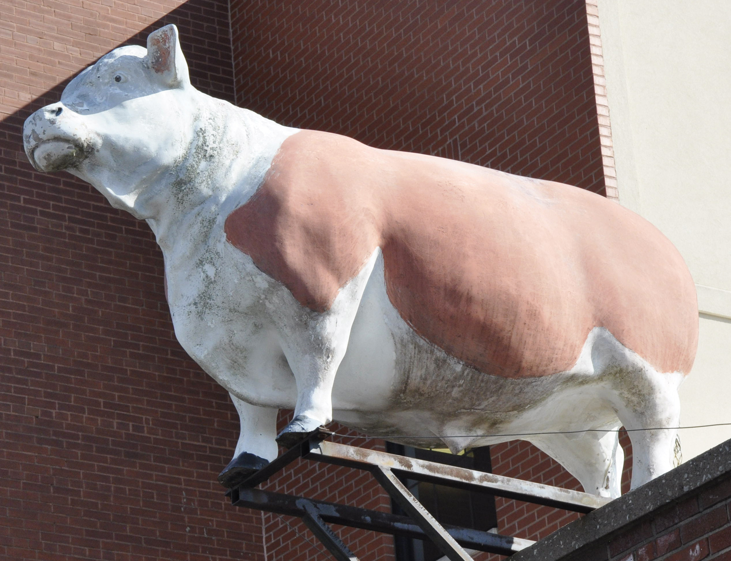 The Worden's Meat building previously housed the Southtown Meat Co. This bull statue was installed on a pole by Southtown. This photo is from 2010. By 2013, Worden's moved to a new location. This statue is not at either the old or new location.