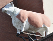 | The fiberglass bull statues described below and on the next pages are smaller than those at the previous pages. They have smooth coats and were typically installed at meat markets. |