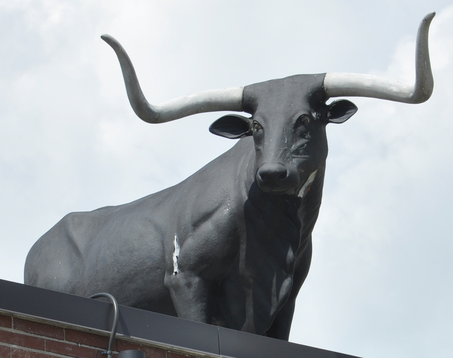 The Bull in Akron was a metal sculpture. It appeared to represent a Longhorn bull. It was installed on a trailer in front of Felons For Hire. These photos are from 2009. By 2013, the business and the Bull were gone. |
