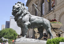 | This pair of bronze Lions were created in 1893 by Edward Kemeys and installed in front of the Art Institute of Chicago. The sculptures are often decorated with wreaths for the Christmas holidays and with hats and helmets for local sports teams. For more, see this website. [map] |