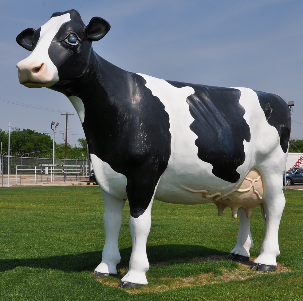 | This Cow stood at the Schepps Dairy plant when these photos were taken in 2011. The business is now known as the Oak Farms Dairy and the cow is still there. [map] |