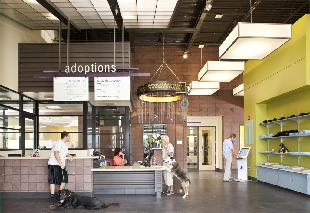 | This Sun Spot sculpture is 20 feet tall and stands next to the Denver Animal Shelter. The dog is composed of 90,000 stainless steel dog tags over wire mesh. The sculpture was created by Laura Haddad and Tom Drugan. It was installed in 2011 and is lit at night with LED bulbs of various colors. There is also a giant dog collar installed inside the shelter's lobby. For more, see these websites: 1, 2, and 3. [map] |