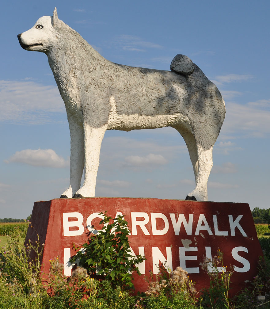 This sign for Boardwalk Kennels features an Alaskan Malamute statue. It was created by Ernie Konikson in 1972 for the Crume Kennels. The business was later renamed the Boardwalk Kennels. However, that business is gone now, too. These photos are from 2011. For more, see this website. [map]