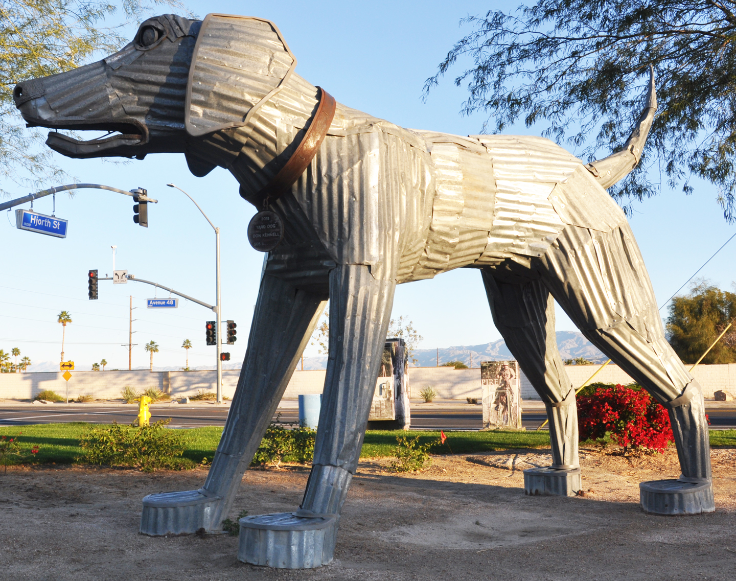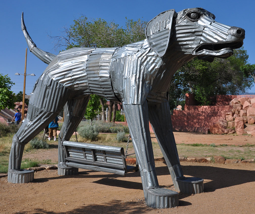 This Yard Dog sculpture in Santa Fe is 20 feet long and made of corrugated sheet metal. It was temporarily installed in Railyard Park and is entitled "Yard Dog." A bench swing hangs from the dog's underside. The sculpture was created by Don Kennell in 2011 who modeled it after his own dog. It was inspired by the mythological Capitoline Wolf, an ancient Roman she-wolf suckling Romulus and Remus, the founders of Rome. This Indio sculpture was removed in 2012 and reinstalled at a different spot in town in 2017. It was to be a temporary installation but it is still there in 2023. For more, see this website. [map]
