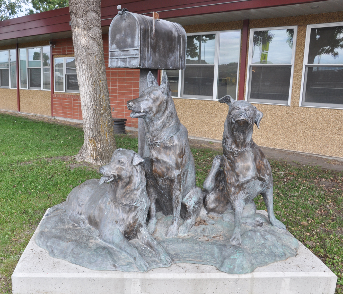 | This bronze sculpture entitled Waiting for the School Bus was created by Pamela Harr of Bridger Bronze. It was installed around 2017 in front of Dawson County High School. It depicts an Australian Shepherd, a Belgian Malinois, and a Rottweiler. [map] |
