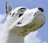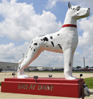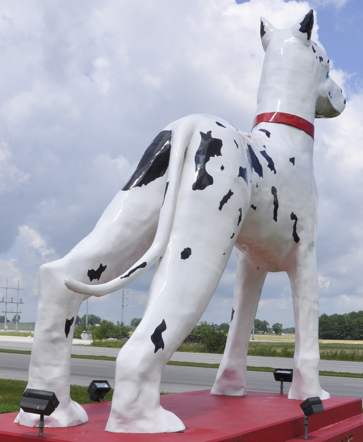| This 20-foot-tall fiberglass Great Dane statue was built in 1960 and was installed in Orlando, FL in front of a Great Dane Trailers facility. The Great Dane has been the company's symbol since 1931. It was knocked over in 1979 during Hurricane David and again in 1980 by a tornado. In the late 1990s, the statue was knocked over by a hit-and-run driver. When the Orlando facility closed in 2001, the statue was moved to Savannah, GA. The statue, aka "Champ," was dressed up for holidays: a green derby hat for St. Patrick's Day, an Uncle Sam hat for July 4th, and a Santa hat with a wreath around its neck for Christmas. In 2017, that location closed and the statue was moved to the Brazil, IN location. [map] |