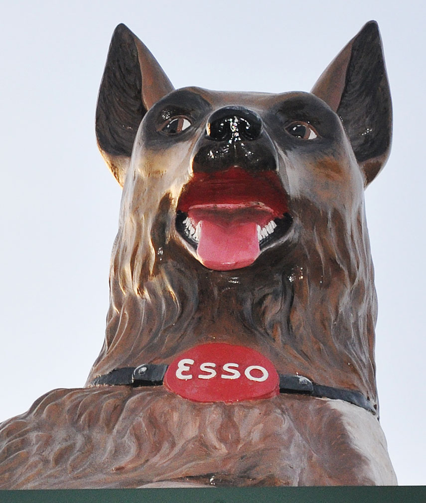 | Esso Watchdog statues were produced by the Esso Oil Company. This German Shepherd was used as the company's home heating oil business mascot from around 1959-1965. These fiberglass statues came in two sizes: seven feet long and three feet long. The larger ones, like this one, were installed on top of the company's oil trucks. This Pottstown statue was located at an Esso Oil delivery company at this site. When Watchdog Condo-Storage opened here, they kept the statue. It is now installed on top of their sign. [map] |