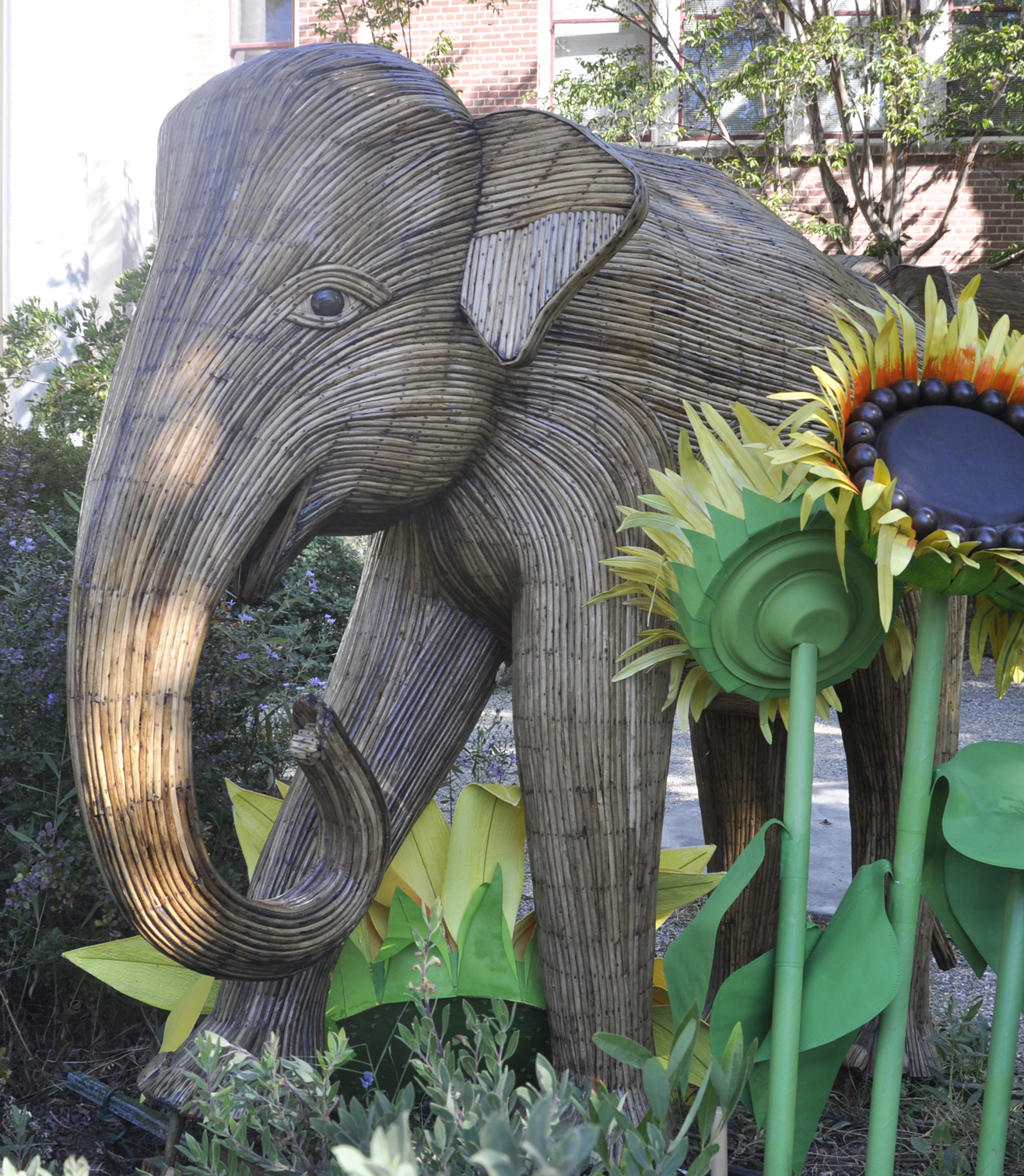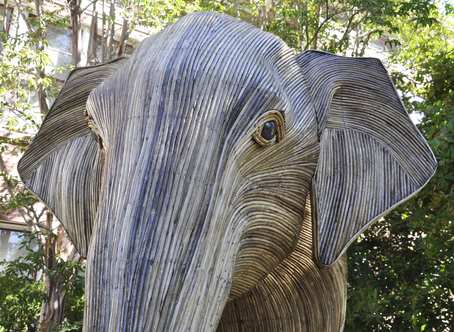 | This Elephant has been installed behind the Blue Room since at least 2011. The gun symbolizes freeway shootings that were going on at the time when the statue was built. The ring represents the circle of life. [map] |