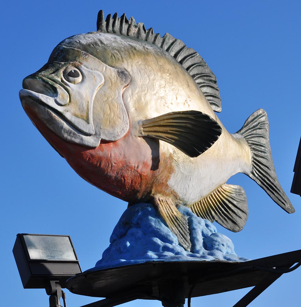 | This Spitting Fish in Austin was built by Bob "Daddy-O" Wade. "The Big One" was originally installed on the roof of "The Big One" restaurant. In 1993, the Hula Hut moved into the space and installed the fish in the river next to the outdoor dining tables. For $2, diners can watch the fish spit water. These photos are from 2018. In 2019, the fish was restored and repainted by Blackout Signs and Metalworks. For more, see this website. |