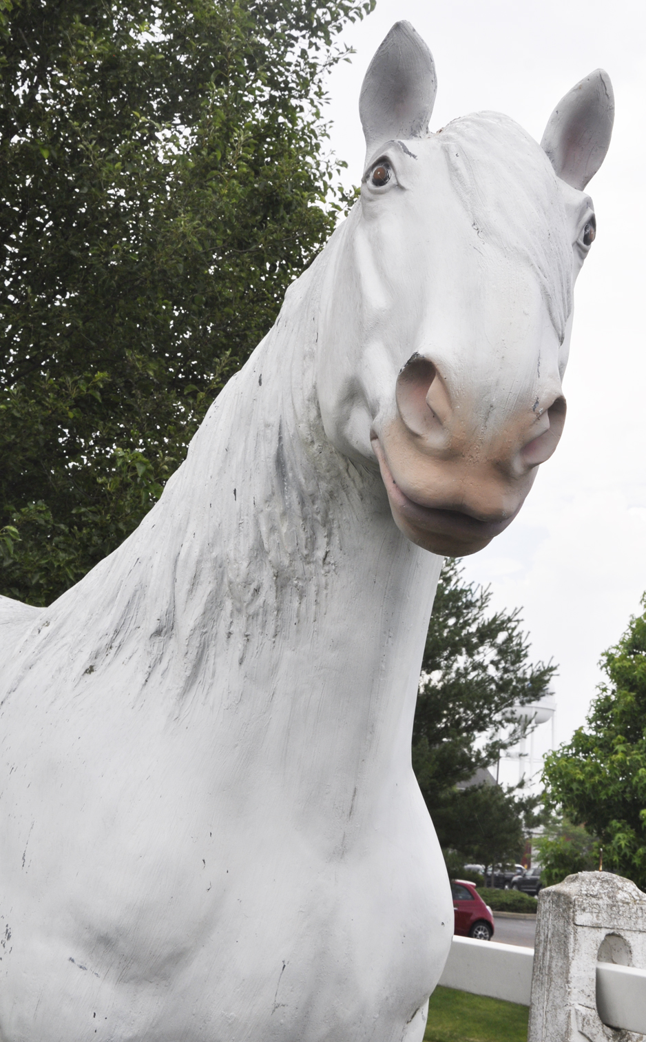 The Garden City Party Store featured this fiberglass Budweiser Clydesdale statue installed on a trailer. These statues were produced by the DWO Fiberglass Co. of Sparta, WI. This photo is from 2010. By 2011, the statue was gone. [photo thanks Mark Comstock]