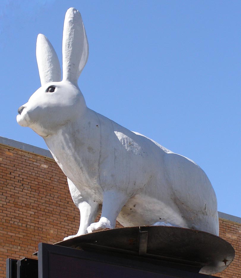 The Rabbit in Gainesville was installed in 1993 in front of the Rabbittown Cafe. The 20-foot-tall rabbit waves to passing motorists from his pedestal. The statue is made from styrofoam coated with fiberglass. He is a tribute to the town's survival through the Depression by raising rabbits for meat. [map]
