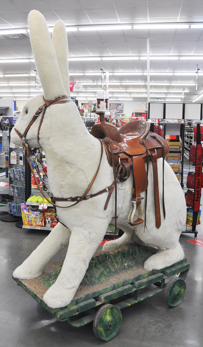 The station closed in the late 1950s. In 1968, another building replaced it to house Big Daddy's Pawn Shop, run by Agan's daughter. Although the plane was gone, the rabbit remained for tourists to pose with for the camera. The pawn shop closed in 2000 and still remains vacant. The rabbit was still there in 2003. By 2007, the rabbit had been moved behind the building and restored. By 2011, the rabbit had been moved to storage. In 2012, he was restored by Clint Wright and installed inside Dot's Ace Hardware. He has fur again and wears a new saddle. For more, see this website. |
